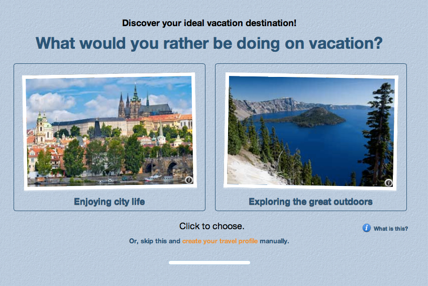 Triporati har ett lika stort utbud som många andra resesidor, absolut. Och besökaren på sidan ställs inför val, javisst. Men det finns en avgörande skillnad. När man loggar in på Triporati ställs inför val med enbart två alternativ. Det första valet är “stad eller landsbygd” och efter det kommer ytterligare några frågor med endast två svarsalternativ. Därefter får man förslag på resmål som passar den profil man stämmer överens med. Varje val görs mellan både text och bild, så det blir enkelt att skapa förståelse för vad det är man väljer – och vad man väljer bort. Många webbutiker och tjänster borde lära sig av Triporati. Det är verkligen ett gott exempel på att ha kunden, slutanvändaren, i fokus.