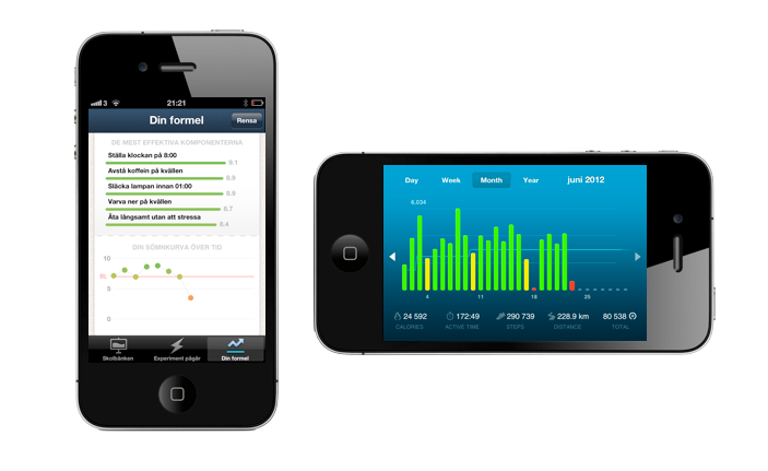 Det krävs lite life hacking för att komma över detta problem. Något jag testat är att kombinera Nike fuelband med vår app Sömnformeln. Med Nike Fuelband sätter man upp mål för hur mycket man vill röra sig på en dag. Armbandet är en typ av stegräknare som fångar in all typ av aktivitet. Twisten med denna produkt är att Nike skapat sin egna enhet “fuel” som alltså är ett mått på hur mycket du rört dig. Som exempel så gav en aktiv dag med gym, cykling och klättring ca 6000 fuels och en dag fylld av skateboardåkande ca 5400 fuels. Min kollega Oskar har skrivit en fantastisk recension av Fuelband här. Det jag börjat undersöka med hjälp av Sömnformeln är att se hur pass mycket bättre jag sover efter en aktiv dag än efter en mer stillsam dag. De flesta är nog överens att träning bäddar för en god natts sömn men för mig som är galen i siffror är det kul att se exakt vilken påverkan fysisk aktivitet har på min sömn.
