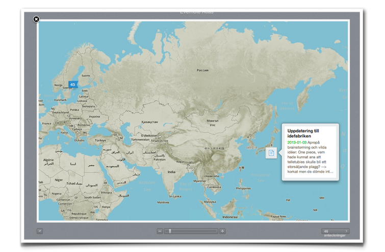 Precis som så mycket i livet så ligger belöningen av träningen ofta ganska långt in i framtiden. För att arbetet ändå ska kännas belönande gäller det att hitta små belöningar på vägen. Jag stötte nyligen på en funktion i programmet Evernote som gjorde mitt idésparande mycket roligare. Funktionen heter Atlas och innebär att man får se vart man befunnit sig när man skapat en vissa anteckning. Då jag “taggar” alla mina idéer med just “idé” kan jag på ett enkelt sätt se vart jag kläcker flest idéer. Som kartan ovan avslöjar så verkar jag vara som mest kreativ hemma, följt av kontoret och sedan hemma hos min mamma. Tar vi en titt på världskartan så verkar Sverige vara den plats där jag är mest kreativ i. Visst är det så att jag spenderar mest tid här men är det ändå inte lite intressant att se vart man befann sig när en specifik idé dök upp?