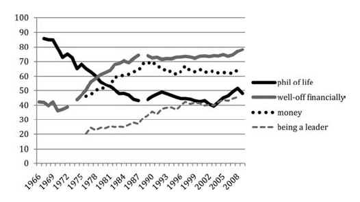 Twenge, J. M., Campbell, W. K., & Freeman, E. C. (2012). Generational differences in young adults’ life goals, concern for others, and civic orientation, 1966-2009. Journal of Personality and Social Psychology, 102(5), 1045-1062.