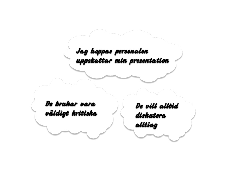 Tankar är svåra att styra och kanske ska du låta bli att ens försöka kontrollera dem. Låt dem leva sitt liv, så kan du leva ditt. Dina tankar är inte sanningar. Det är fullt möjligt att hålla en presentation samtidigt som du har tanken att det kommer att gå åt helvete.