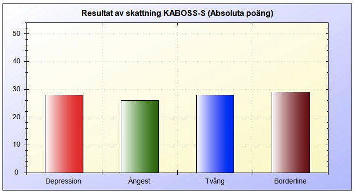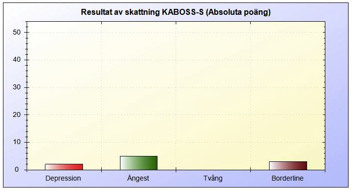 Enligt det självskattningsformulär (KABOSS-S, Karolinska Affektiva och Borderline Symptomskalor – Självskattning) som fylldes i vid första samtalet låg Peter högt på samtliga skalor: